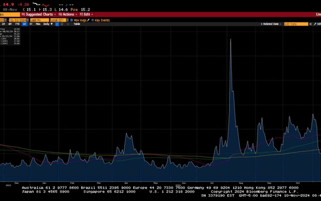 The S&P 500 notched its 50th all-time high of 2024 as investors piled into equities after a decisive US election.  Wall Street embraced the idea that President-Elect Trump would enact several pro-growth policies to bolster corporate profits.  Lower taxes, deregulation, and a protectionist stance on trade sent Small-caps, Financials, and Technology higher.  The definitive results sent VIX, a measure of volatility, lower by 5 points or nearly 22% in a single day!  The notion of lower taxes and no fiscal austerity initially hit the bond market, where the US 10-year yield advanced by seventeen basis points.  Interestingly, the bond market settled down over the next three sessions to end the week higher.