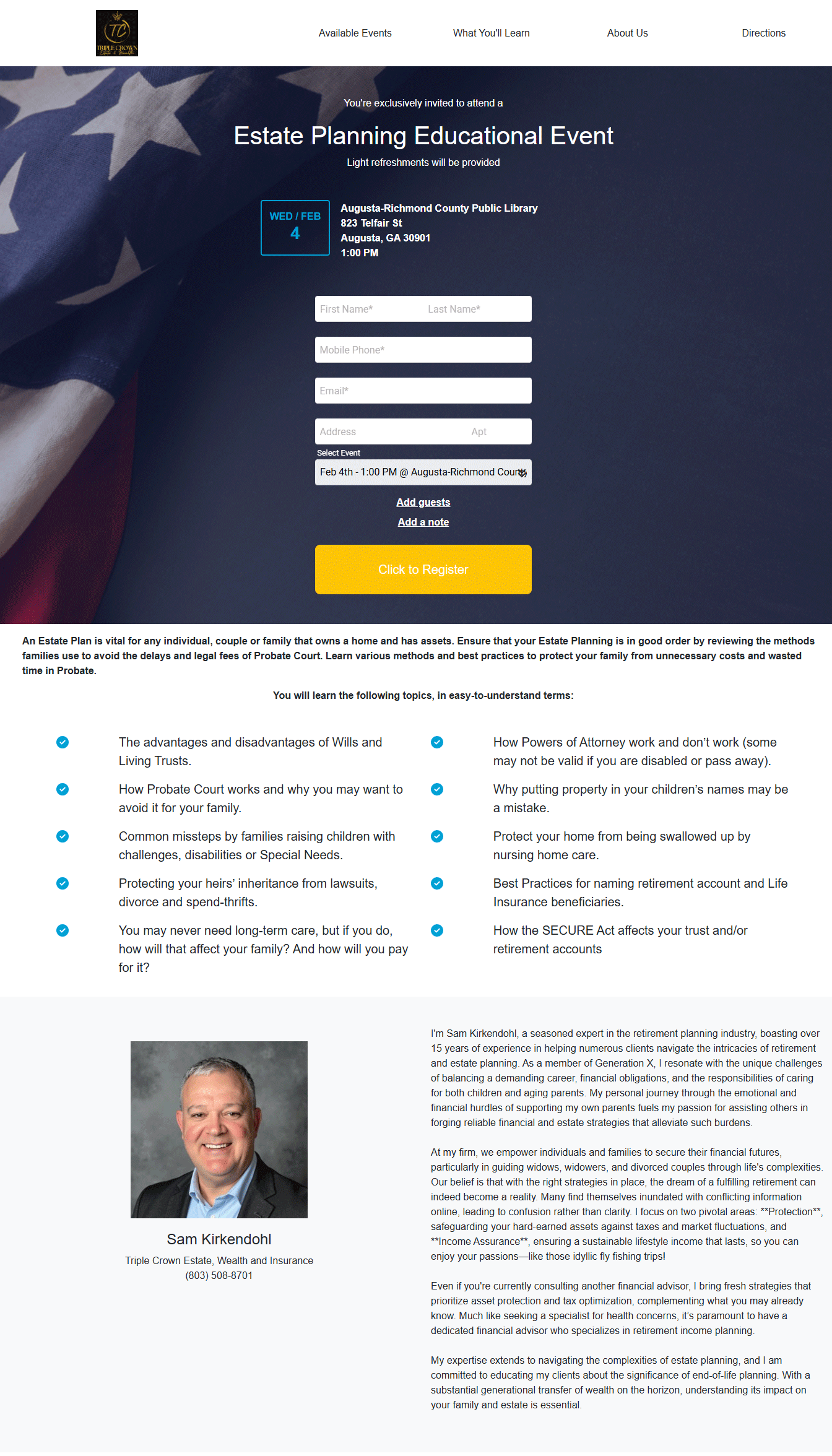 Workshops Schedule a Meeting With Sam Kirkendohl or Call 803-508-8701 Click Here Workshops Information Requested Your Name(Required)Phone(Required)Email(Required) Best Time to Call(Required)Enter details hereMessageCAPTCHA Find a Triple Crown Estate, Wealth & Insurance Location The place to build your future is right down the road. Aiken, South Carolina 900 Trail Ridge Rd, Suite # 155Aiken, SC 29803 Office: 803-508-8701 sam@triplecrownestateandwealth.com